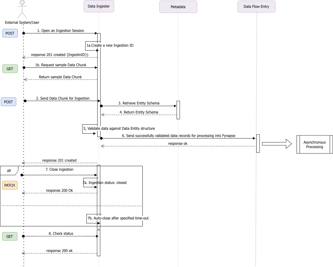 The response is synchronous and returns a 201 status once the data is successfully processed. Any validation or conversion errors are returned with the failed data in the response body. If the ingestion session is already closed (7b), then the request will be rejected with the 409 status. If the ingestion session was manually closed during data upload (7a), the data submitted in the request will still be processed, but no new data will be ingested.