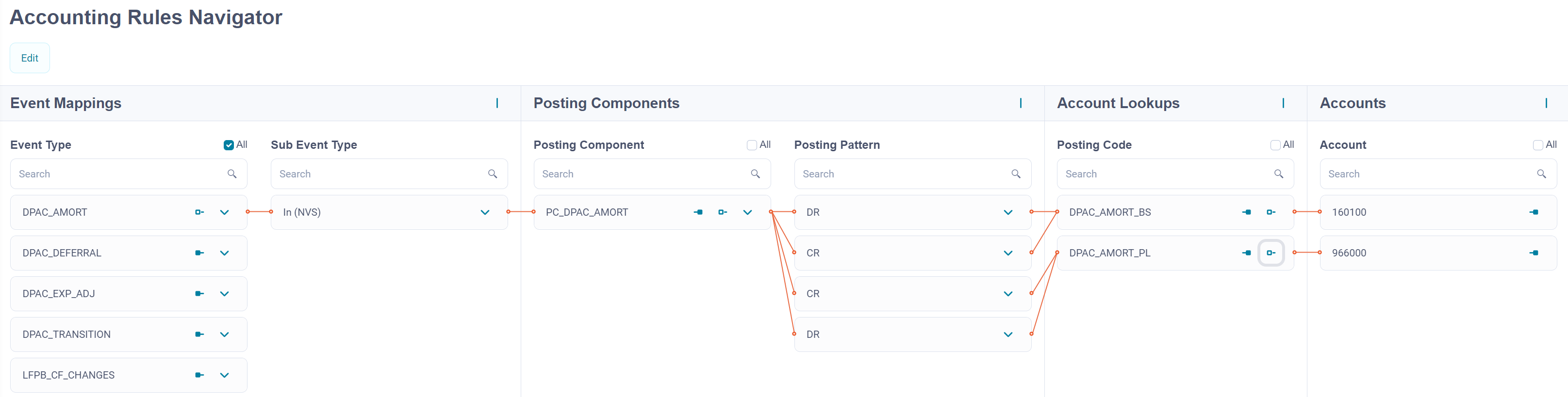 The Accounting Rules Navigator is a visual representation of the accounting rules within the Accounting Engine. The screen allows you to view the data and correlations between the data. By expanding different sections and using the provided drill-down and filtering capabilities, you can see the full picture of a given record.