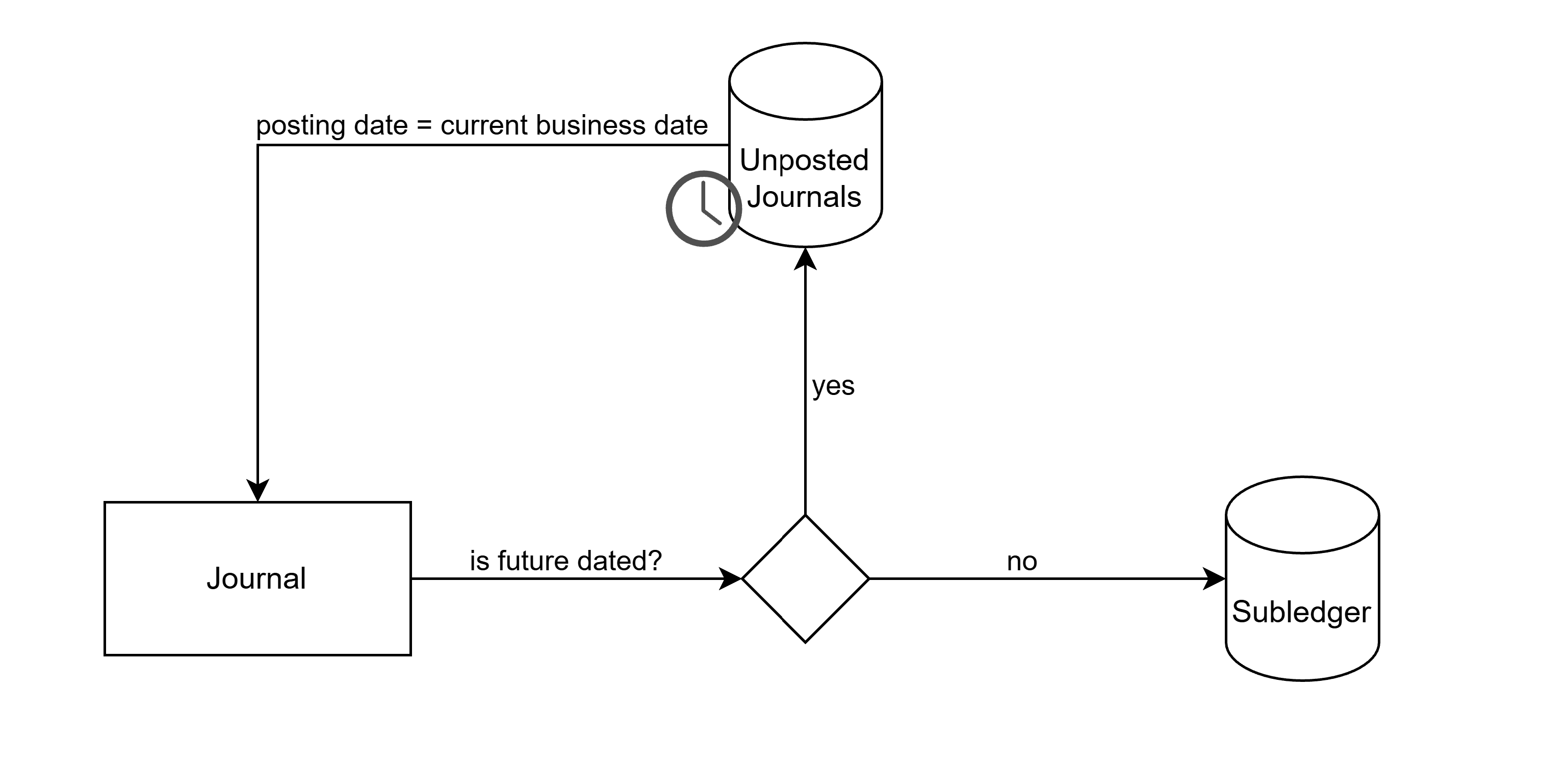 An Unposted Journal is a Journal with a future posting date, e.g., Journals for deferred payments. They are stored in the Unposted Journals Entity. Once their posting date arrives, they are posted and stored in the Journals Entity.