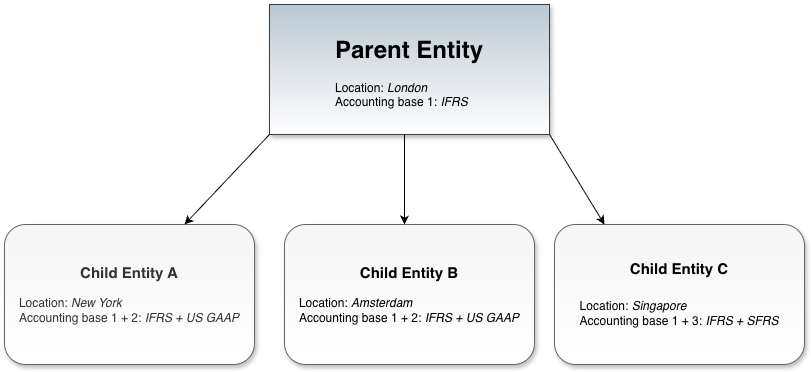 An Accounting Base allows you to create fixed configurations of settings which can later be used as accounting base for different reporting requirements. Such a configuration of a group of settings can then be consistently applied for different reporting requirements, e.g. IFRS or US GAAP. By using an Accounting Base you maintain a high-level of consistency and control across your system, streamlining the process of adding new entities and limiting the possibility of configuration errors.