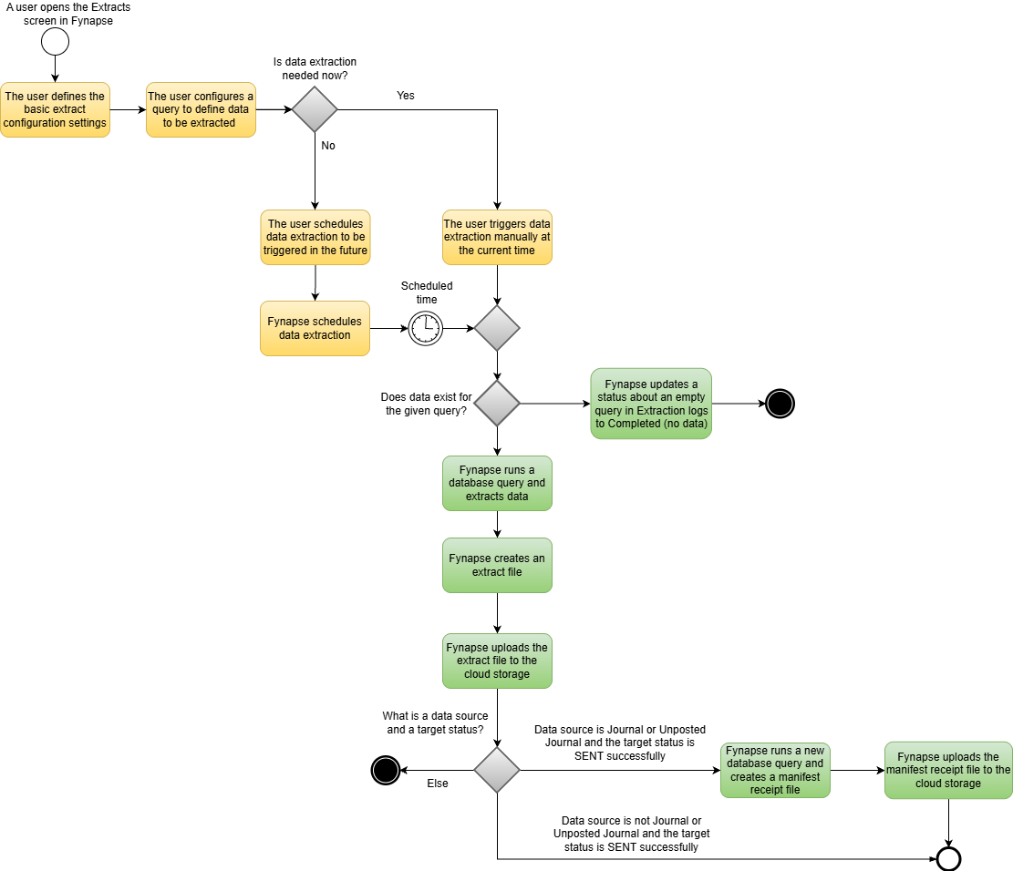 The Extraction functionality allows you to extract Journals, Unposted Journals, Errors, Balances, and user-defined Entities (stored in FDS) automatically according to schedules defined by you to eliminate manual extractions. Extracted data can be later used by downstream services, for example, General Ledger.