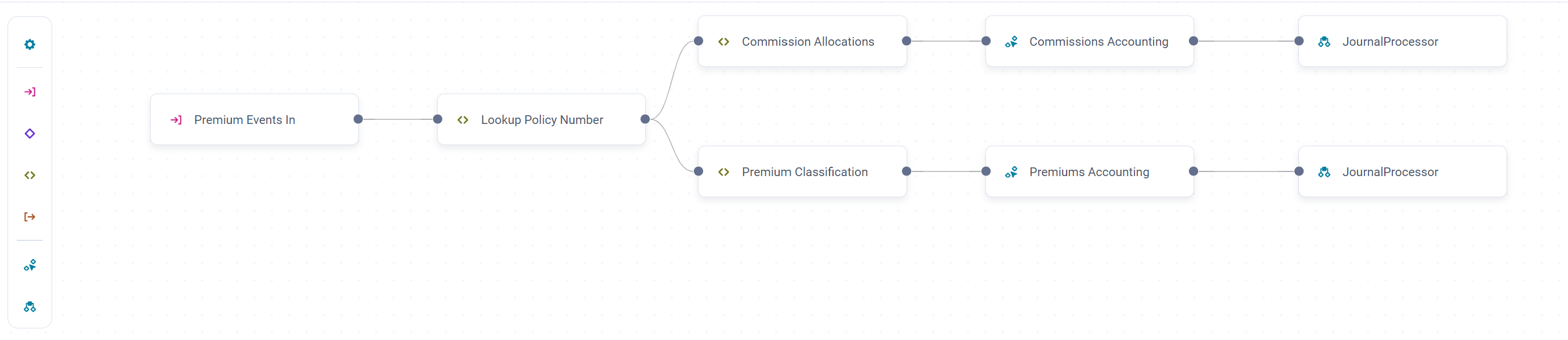 1 "flows": [ 2 { 3 "versionStatus": "Published", 4 "name": "ConditionalAllocation", 5 "graph": { 6 "edges": { 7 "2230feee-76db-48dd-bb90-30171ece1206:0": [ 8 "638a4aed-1acd-43e5-9a88-0f60bb1211b3" 9 ], 10 "2230feee-76db-48dd-bb90-30171ece1206:1": [ 11 "7a40a4eb-bd7b-4146-95cf-00316da86f41" 12 ], 13 "2230feee-76db-48dd-bb90-30171ece1206:2": [ 14 "5af4fb62-5c23-4c4a-aee3-cfaa1f7f09d8" 15 ], 16 "5af4fb62-5c23-4c4a-aee3-cfaa1f7f09d8:0": [ 17 "edf44cd0-1964-40c2-964e-3e6a1b1b3b21" 18 ], 19 "638a4aed-1acd-43e5-9a88-0f60bb1211b3:0": [ 20 "35aa4a57-af6a-4381-8135-25771c280dd4" 21 ], 22 "741a2ec1-5d9e-494c-8d74-61e14187208a:0": [ 23 "45bd8b34-6e24-4f9a-a717-4abd1129711d" 24 ], 25 "7a40a4eb-bd7b-4146-95cf-00316da86f41:0": [ 26 "741a2ec1-5d9e-494c-8d74-61e14187208a" 27 ], 28 "edf44cd0-1964-40c2-964e-3e6a1b1b3b21:0": [ 29 "d17901e1-ba74-42bd-aadc-a2245a62a602" 30 ], 31 "fb923048-50a2-4120-b30a-6151f9dcd136:0": [ 32 "2230feee-76db-48dd-bb90-30171ece1206" 33 ] 34 }, 35 "nodes": { 36 "7a40a4eb-bd7b-4146-95cf-00316da86f41": { 37 "step": { 38 "type": "Allocation", 39 "name": "Cost Allocation", 40 "configuration": { 41 "allocationType": "Quantity", 42 "amountMapping": [ 43 { 44 "amount": { 45 "group": "CALCULATED_INPUT", 46 "path": [ 47 "transactionAmount" 48 ] 49 }, 50 "currency": { 51 "group": "CALCULATED_INPUT", 52 "path": [ 53 "transactionCurrency" 54 ] 55 } 56 } 57 ], 58 "reference": { 59 "source": { 60 "namespace": "fynapse", 61 "name": "CostAllocation" 62 }, 63 "responsibleCostCentre": [ 64 "department" 65 ], 66 "driver": [ 67 "headcount" 68 ] 69 }, 70 "allocationKeys": [ 71 { 72 "inputAttribute": [ 73 "region" 74 ], 75 "referenceAttribute": [ 76 "country" 77 ], 78 "operator": "EQ" 79 } 80 ] 81 } 82 }, 83 "x": 615, 84 "y": 75 85 }, 86 "2230feee-76db-48dd-bb90-30171ece1206": { 87 "step": { 88 "type": "Condition", 89 "name": "Allocation Routing", 90 "routing": [ 91 { 92 "sourcePort": "1", 93 "condition": { 94 "name": "Cost", 95 "expressions": [ 96 { 97 "left": { 98 "group": "INPUT", 99 "path": [ 100 "cashFlowType" 101 ] 102 }, 103 "operator": "EQ", 104 "right": { 105 "type": "TEXT", 106 "textValue": "Commission", 107 "integerValue": 0, 108 "decimalValue": 0 109 } 110 }, 111 { 112 "left": { 113 "group": "INPUT", 114 "path": [ 115 "cashFlowType" 116 ] 117 }, 118 "operator": "EQ", 119 "right": { 120 "type": "TEXT", 121 "textValue": "DPAC", 122 "integerValue": 0, 123 "decimalValue": 0 124 } 125 }, 126 { 127 "left": { 128 "group": "INPUT", 129 "path": [ 130 "cashFlowType" 131 ] 132 }, 133 "operator": "EQ", 134 "right": { 135 "type": "TEXT", 136 "textValue": "Expense", 137 "integerValue": 0, 138 "decimalValue": 0 139 } 140 } 141 ], 142 "operator": "ANY" 143 } 144 }, 145 { 146 "sourcePort": "2", 147 "condition": { 148 "name": "Premium", 149 "expressions": [ 150 { 151 "left": { 152 "group": "INPUT", 153 "path": [ 154 "cashFlowType" 155 ] 156 }, 157 "operator": "EQ", 158 "right": { 159 "type": "TEXT", 160 "textValue": "Direct Premium", 161 "integerValue": 0, 162 "decimalValue": 0 163 } 164 } 165 ], 166 "operator": "ALL" 167 } 168 } 169 ] 170 }, 171 "x": 315, 172 "y": 120 173 }, 174 "5af4fb62-5c23-4c4a-aee3-cfaa1f7f09d8": { 175 "step": { 176 "type": "Allocation", 177 "name": "Premium Allocation", 178 "configuration": { 179 "allocationType": "Quantity", 180 "amountMapping": [ 181 { 182 "amount": { 183 "group": "CALCULATED_INPUT", 184 "path": [ 185 "transactionAmount" 186 ] 187 }, 188 "currency": { 189 "group": "CALCULATED_INPUT", 190 "path": [ 191 "transactionCurrency" 192 ] 193 } 194 } 195 ], 196 "reference": { 197 "source": { 198 "namespace": "fynapse", 199 "name": "PremiumAllocation" 200 }, 201 "responsibleCostCentre": [ 202 "department" 203 ], 204 "driver": [ 205 "headcount" 206 ] 207 }, 208 "allocationKeys": [ 209 { 210 "inputAttribute": [ 211 "region" 212 ], 213 "referenceAttribute": [ 214 "country" 215 ], 216 "operator": "EQ" 217 } 218 ] 219 } 220 }, 221 "x": 615, 222 "y": 165 223 }, 224 "45bd8b34-6e24-4f9a-a717-4abd1129711d": { 225 "step": { 226 "type": "JournalProcessor", 227 "name": "JournalProcessor" 228 }, 229 "x": 1185, 230 "y": 75 231 }, 232 "d17901e1-ba74-42bd-aadc-a2245a62a602": { 233 "step": { 234 "type": "JournalProcessor", 235 "name": "JournalProcessor" 236 }, 237 "x": 1185, 238 "y": 165 239 }, 240 "638a4aed-1acd-43e5-9a88-0f60bb1211b3": { 241 "step": { 242 "type": "AccountingEngine", 243 "name": "AccountingEngine", 244 "mapping": [ 245 { 246 "source": { 247 "group": "CALCULATED_INPUT", 248 "path": [ 249 "legalEntity" 250 ] 251 }, 252 "target": { 253 "path": [ 254 "legalEntity" 255 ] 256 }, 257 "contextMapping": false 258 }, 259 { 260 "source": { 261 "group": "CALCULATED_INPUT", 262 "path": [ 263 "affiliateEntity" 264 ] 265 }, 266 "target": { 267 "path": [ 268 "affiliateEntity" 269 ] 270 }, 271 "contextMapping": false 272 }, 273 { 274 "source": { 275 "group": "CALCULATED_INPUT", 276 "path": [ 277 "region" 278 ] 279 }, 280 "target": { 281 "path": [ 282 "region" 283 ] 284 }, 285 "contextMapping": false 286 }, 287 { 288 "source": { 289 "group": "CALCULATED_INPUT", 290 "path": [ 291 "eventType" 292 ] 293 }, 294 "target": { 295 "path": [ 296 "eventType" 297 ] 298 }, 299 "contextMapping": false 300 }, 301 { 302 "source": { 303 "group": "CALCULATED_INPUT", 304 "path": [ 305 "coreDate" 306 ] 307 }, 308 "target": { 309 "path": [ 310 "coreDate" 311 ] 312 }, 313 "contextMapping": false 314 }, 315 { 316 "source": { 317 "group": "CALCULATED_INPUT", 318 "path": [ 319 "valueDate" 320 ] 321 }, 322 "target": { 323 "path": [ 324 "valueDate" 325 ] 326 }, 327 "contextMapping": false 328 }, 329 { 330 "source": { 331 "group": "CALCULATED_INPUT", 332 "path": [ 333 "transactionCurrency" 334 ] 335 }, 336 "target": { 337 "path": [ 338 "transactionCurrency" 339 ] 340 }, 341 "contextMapping": false 342 }, 343 { 344 "source": { 345 "group": "CALCULATED_INPUT", 346 "path": [ 347 "transactionAmount" 348 ] 349 }, 350 "target": { 351 "path": [ 352 "transactionAmount" 353 ] 354 }, 355 "contextMapping": false 356 }, 357 { 358 