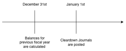 Remember, the date when the Yearend Cleardown process is run is calculated based on the final day of the Fiscal Year determined by the Fiscal Calendar assigned to the given Accounting Base/Subledger Node combination. So you need to run the Yearend Cleardown process on the first day of the new fiscal year or within the Grace Days for the first period.